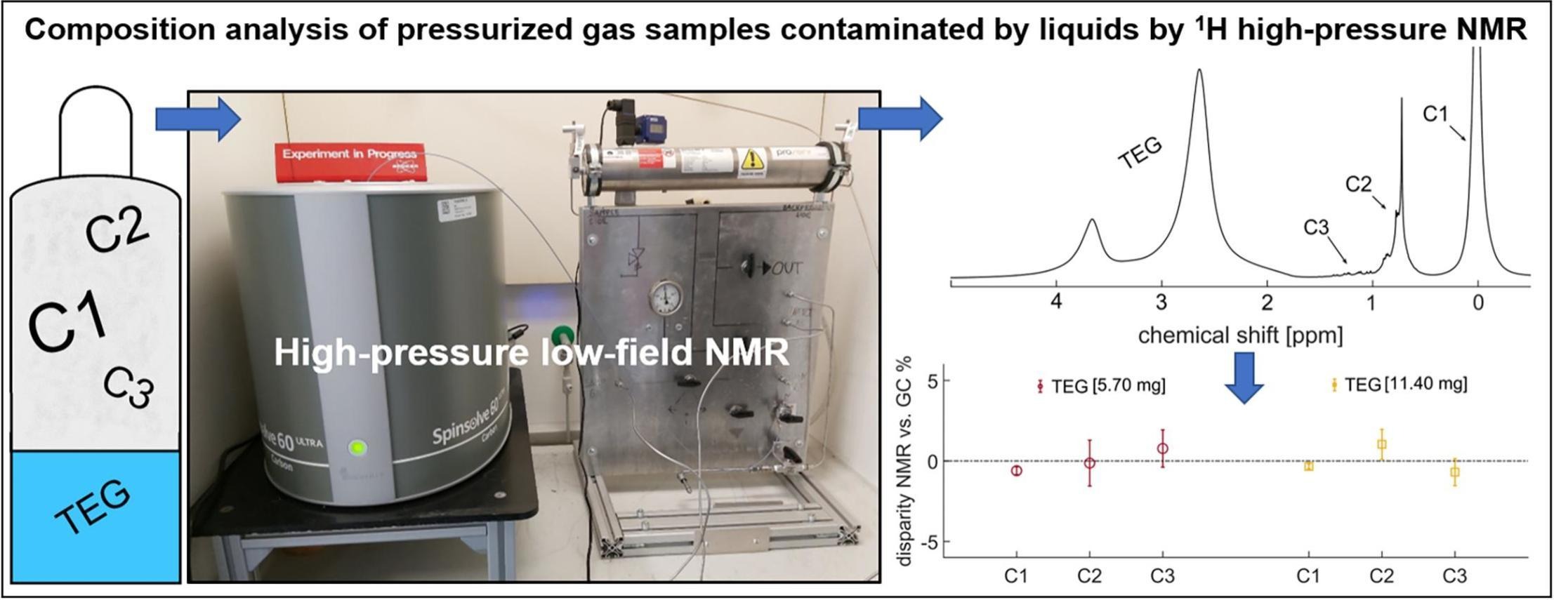 Natural gas (NG) plays a key role in the transition to greener energy sources. Accurate composition analysis is essential for determining NG’s commercial value and ensuring efficiency across the entire value chain. Since NG typically contains water, it is dehydrated using agents like triethylene glycol (TEG). However, residual liquid TEG may remain in the pipeline, compromising sample quality for conventional NG composition analysis, which can measure only the gaseous phase. Thus, this work demonstrates the applicability of high-pressure (HP) benchtop 1H NMR spectroscopy for analyzing wet NG, with the simultaneous detection of gas and liquid phases. To enhance the robustness of the method, additional quality control parameters (QC) for the NMR signal were implemented alongside with previously established QCs. The methodology was validated using a three-component NG sample at 200 bar, in the presence of TEG as dynamic droplets and at varying stationary amounts within the sensitive volume. The determined NG composition was in excellent agreement with the vendor certificate. Moreover, the detection and quantification limits of TEG under the employed experimental conditions were determined. This work represents a significant step towards the integration of HP benchtop NMR spectroscopy for real-time monitoring of wet NG composition in industrial environments.