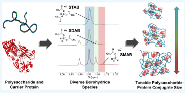 Pneumococcal conjugate vaccines (PCVs) have effectively enhanced immunogenicity by conjugating a carrier protein to a purified capsular polysaccharide. The degree of conjugation influences the effective size of the final conjugate, and control of this reaction is critical in developing a robust process. Sodium triacetoxyborohydride (STAB) is a common reducing agent used to perform reductive aminations to provide a means for conjugation and can be utilized as an in situ preparation in the PCV conjugation process. Robust analytical methods for characterizing STAB were not previously available. Herein, we develop methods to rapidly assess STAB for both activity and composition using quantitative NMR methodologies and apply these learnings to improve our understanding of the bioconjugation process. It was determined that decreasing the reaction temperature to synthesize STAB resulted in a more active reducing reagent enriched with sodium diacetoxyborohydride (SDAB). Conjugation reactions performed with a model polysaccharide and carrier protein found that an increased SDAB content led to larger conjugation sizes. Moreover, we established a correlation between the conjugate size and SDAB concentration by charging the reaction with varying molar equivalents of SDAB. Through this work, a deeper understanding of the critical attributes of STAB was developed using diverse analytical methods, and these learnings can be applied to develop a more appropriate control strategy for producing glycoconjugate therapeutics.