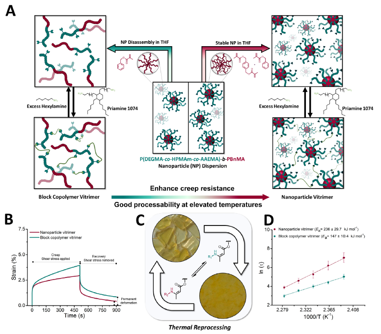 Vitrimers, a class of covalent adaptable networks (CANs), promise sustainability through recyclability and reprocessability, yet suffer from creep under prolonged stress due to dynamic bond exchange. Here, a materials design strategy is reported that integrates polymerization-induced self-assembly (PISA) to embed core-crosslinked nanoparticles within vitrimer networks, yielding hierarchical dual-crosslinked systems with a reduction of creep susceptibility by up to 90% at 150 °C yet good reprocessability at elevated temperatures (Ea = 246 kJ mol−1). These spherical nanostructures restrict chain mobility and act as rheological modifiers that can be synthetically tuned through core block length. This approach offers precise architectural control, leveraging nanoparticle phase morphology to direct bulk vitrimer properties. This study establishes a new paradigm for creep-resistant CANs and showcases how PISA can advance vitrimer performance by structurally encoding mechanical robustness and reprocessability.