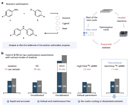 The instrumental analysis of reaction mixtures is usually the rate-determining step in the optimization of chemical processes. Traditionally, reactions are analyzed by gas chromatography, HPLC or quantitative NMR spectroscopy on high-field spectrometers. However, chromatographic methods require elaborate work-up and calibration protocols, and high-field NMR spectrometers are expensive to purchase and operate. This protocol describes an inexpensive and highly effective analysis method based on low-field benchtop NMR spectroscopy. Its key feature is the use of fluorine-labeled model substrates that, because of the wide chemical shift range and high sensitivity of 19F, enable separate, quantitative detection of product and by-product signals even on low-field, permanent magnet spectrometers. An external lock/shim device obviates the need for deuterated solvents, permitting the direct, noninvasive measurement of crude reaction mixtures with minimal workup. The low field-strength facilitates a homogeneous excitation over a wide chemical shift range, minimizing systematic integration errors. The addition of the optimal amount of the nonshifting relaxation agent tris(acetylacetonato) iron(III) minimizes relaxation delays at full resolution, reducing the analysis time to 32 s per sample. The correct choice of processing parameters is also crucial. A step-by-step guideline is provided, the influence of all parameters, including adjustments needed when using high-field spectrometers, is discussed and potential pitfalls are highlighted. The wide applicability of the analytical protocol for reaction optimization is illustrated by three examples: a Buchwald-Hartwig amination, a Suzuki coupling and a C–H arylation reaction.