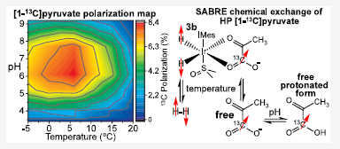Hyperpolarized [1-13C]pyruvate has emerged as a next-generation molecular probe for in vivo metabolic flux imaging in deep tissue. This molecular contrast agent is now under evaluation in over 50 clinical trials, according to clinicaltrials.gov. Hyperpolarized [1-13C]pyruvate is produced through dissolution dynamic nuclear polarization (d-DNP) for clinical research use. This remarkable hyperpolarization technique is regarded as expensive (>$2 M equipment cost) and slow (1 h production). One alternative hyperpolarization technique called Signal Amplification By Reversible Exchange (SABRE) in SHield Enables Alignment Transfer to Heteronuclei (SABRE-SHEATH) has recently garnered substantial attention for production of hyperpolarized [1-13C]pyruvate quickly (in 1 min) and inexpensively (<$20K equipment). It has been successfully demonstrated in vivo for metabolic imaging of cancer. This technique relies on the simultaneous chemical exchange of parahydrogen, acting as a source of nuclear spin order, and [1-13C]pyruvate on a Ir-IMes polarization transfer catalyst at ∼0.4 μm magnetic field. The SABRE catalyst forms two kinds of complexes with parahydrogen-derived hydrides, pyruvate, and dimethyl sulfoxide, acting as a critically important coligand; however, only the complex that binds pyruvate in an equatorial position can release hyperpolarized [1-13C]pyruvate into the solution to enable bulk HP [1-13C]pyruvate production for use in molecular imaging and other applications. Here, we investigate the interplay of pH and temperature with the SABRE-SHEATH hyperpolarization of [1-13C]pyruvate. Temperature and pH modulate this process in remarkable and complementary ways, greatly affecting pyruvate exchange and 13C relaxation dynamics. The overall process is optimal at pH (methanol) of 6.5−7.7 and a temperature of 6 °C: indeed, the catalyst-bound pyruvate exhibits high 13C polarization levels in excess of 25%. The 13C polarization results are additionally supported by 13C relaxation dynamics at a polarization field of 0.4