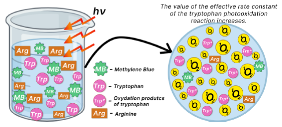 The effect of arginine (Arg) on the efficiency of singlet oxygen photogeneration (determined by the intensity of 1O2 luminescence and the rate of tryptophan photooxidation) in the presence of photoditazine (PDZ), methylene blue (MB), and rose bengal (RB) solubilized with polyvinylpyrrolidone (PVP) was studied. It was demonstrated that the efficiency of the tryptophan photooxidation catalyzed by MB increases in the presence of arginine or arginine with PVP. A contrasting behavior was observed for rose bengal (RB) and photoditazine (PDZ), where arginine reduced the photooxidation rate. As shown in this work, this effect may be associated with a slight decrease in the photocatalytic activity of photosensitizers (PS) due to the interaction between chlorin or RB with arginine. It is suggested that complex systems PS-Arg-Trp or PS-Arg-Trp-PVP are formed, in which PS can be associated with Arg, Trp and PVP. But for RB and PDZ the addition of arginine and PVP together resulted in the enhancement of the photooxidation rate constant keff compared to RB or PDZ alone. This effect may be associated with the formation of complex systems PS-Arg-Trp or PS-Arg-Trp-PVP, in which PS can be associated with Arg, Trp and PVP.
